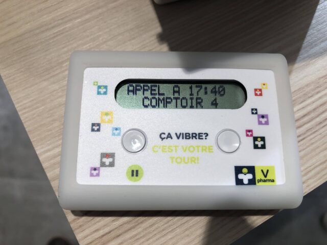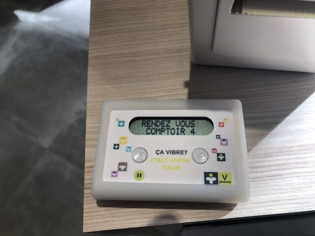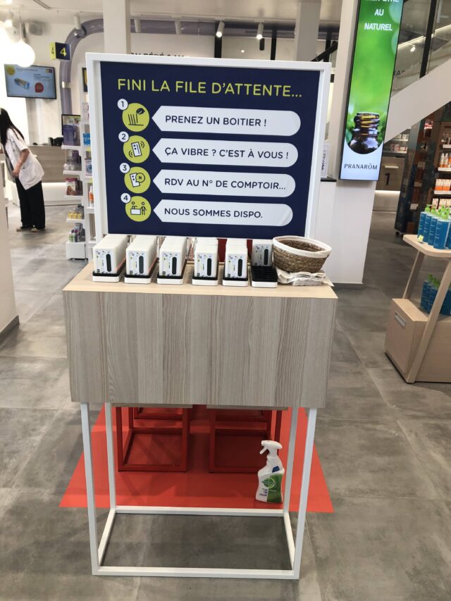 The latest pharmacy installed was VPharma in the city of Liege (Belgium). In the entrance, 60 Weasy cards are available in self-service. When the patient takes one, the Weasy displays the number of persons before him. When a counter is available, the Weasy buzzes and vibrates by displaying the counter to go.