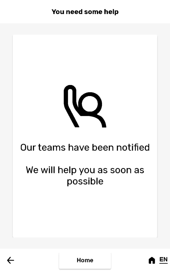 If a workstation is connected with the “Kiosk alerts” box checked, a “I would like someone to come pick me up” button appears at the botton of the screen allowing the visitor to request for assistance.