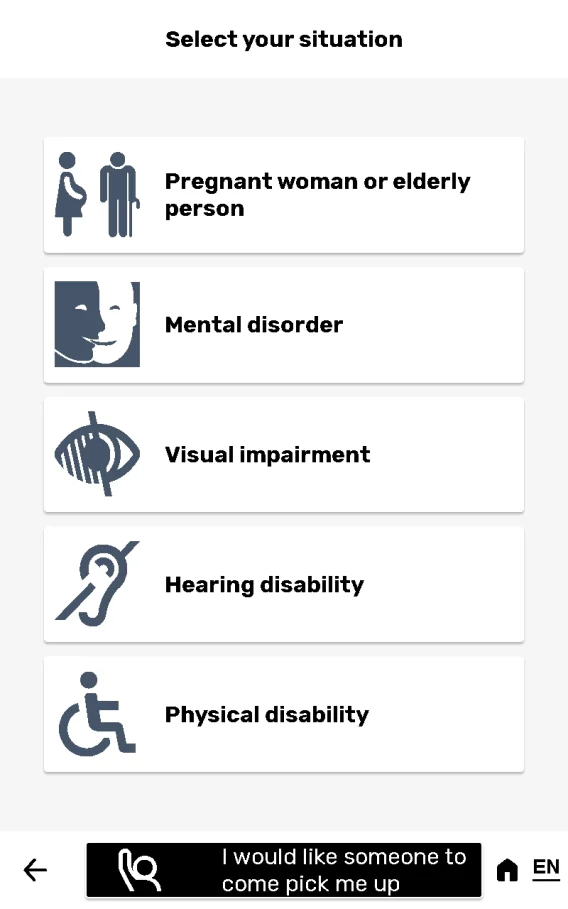 Once the setting is activated, the display on the kiosk is modified: an area at the bottom of the screen enables the visitor to indicate his disability. When he touches this area, the voice guidance announces the title of each page. Each scenario is adapted to the visitor’s declared disability.
