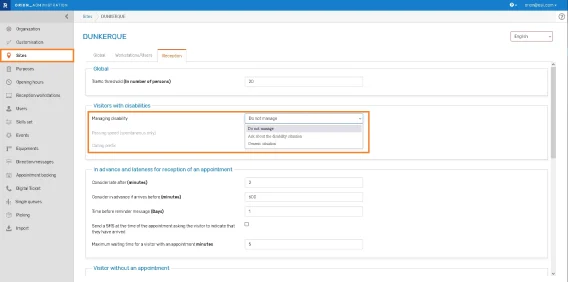 - Either the visitor indicate that he/she has a disability but without specifying which one. The kiosk screens adapt as if the visitor had all types of disability (screens without images and in black and white, selection and navigation buttons are at the bottom of the screen on the Stela kiosk, larger font, mandatory form fields, no ticket selection).