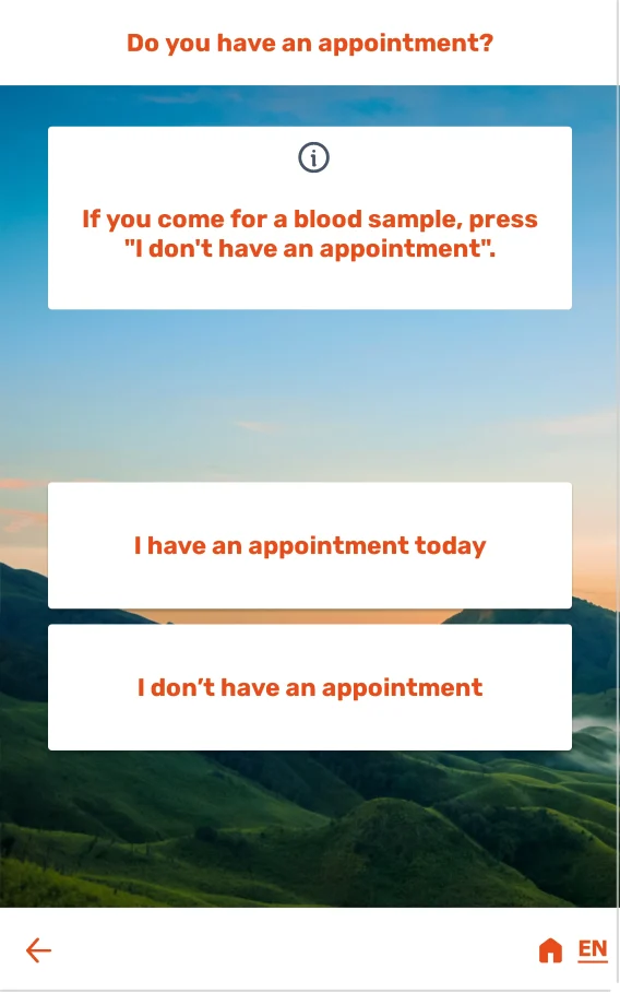 If a workstation is connected, an intermediate screen is displayed to find out if the visitor wants to continue on the kiosk or if he/she prefers an agent to come and get him/her.