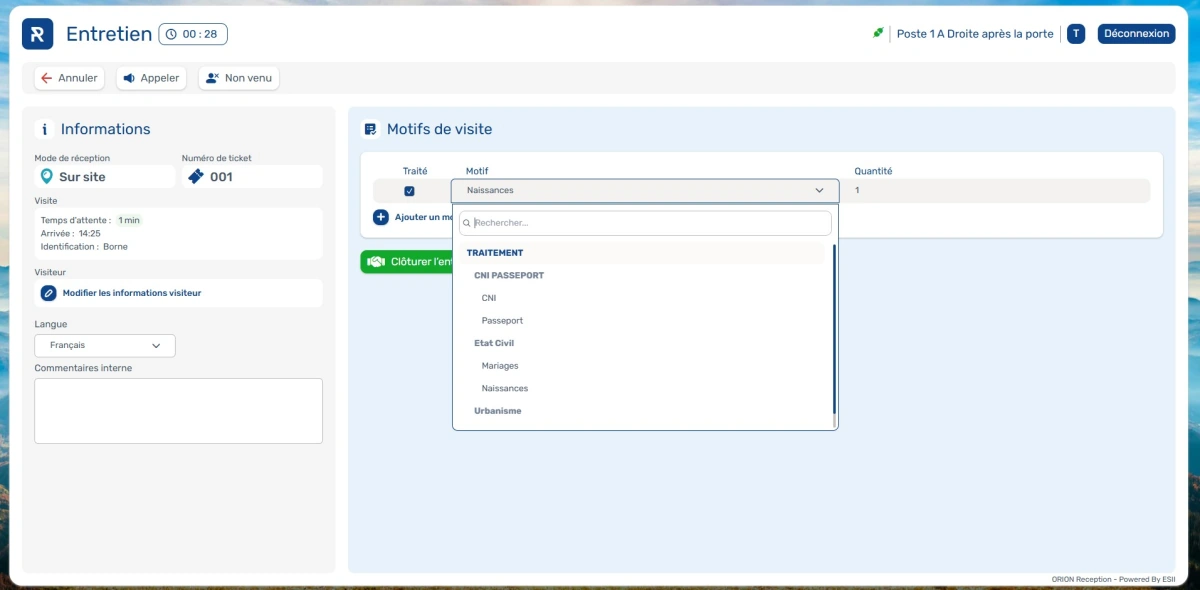 • Les libellés des motifs dans Orion (en particulier ceux à destination des visiteurs) doivent être clairement compréhensibles et formulés sans abréviations ni vocabulaire interne spécifique (ex : éviter « CNI », « État civil », « Admissions »).